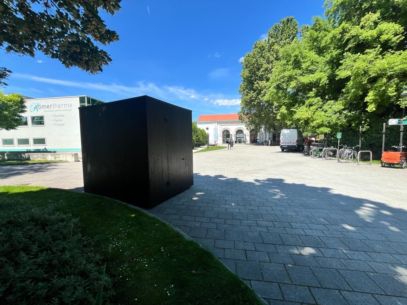 Accessibila Ein Objekt, formal reduziert und archaisch, schwebt ein bisschen über den Pflastersteinen, kümmert sich nicht