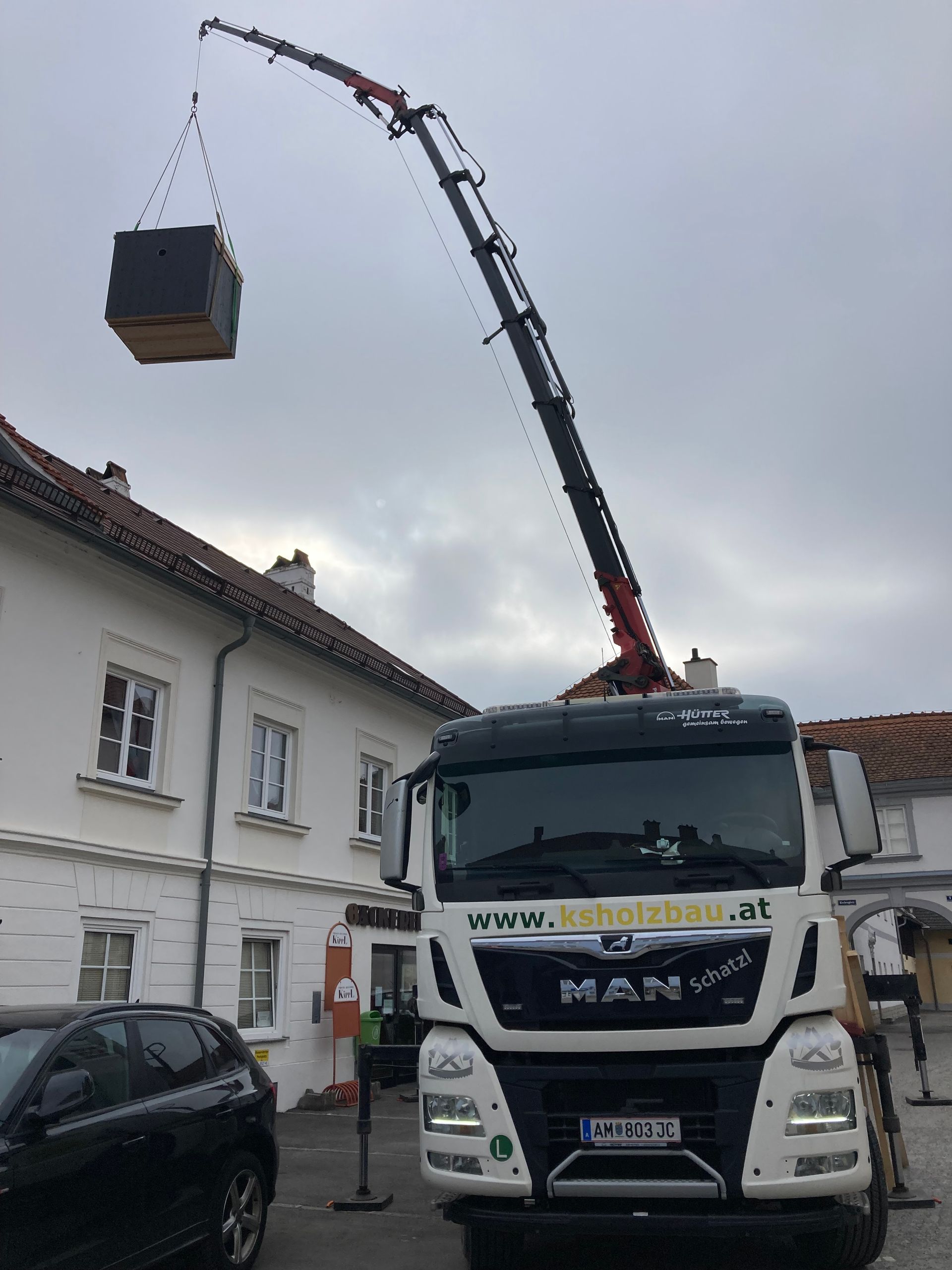 Holzkonstruktion, außen schwarz lackiert, innen weiß lackiert.