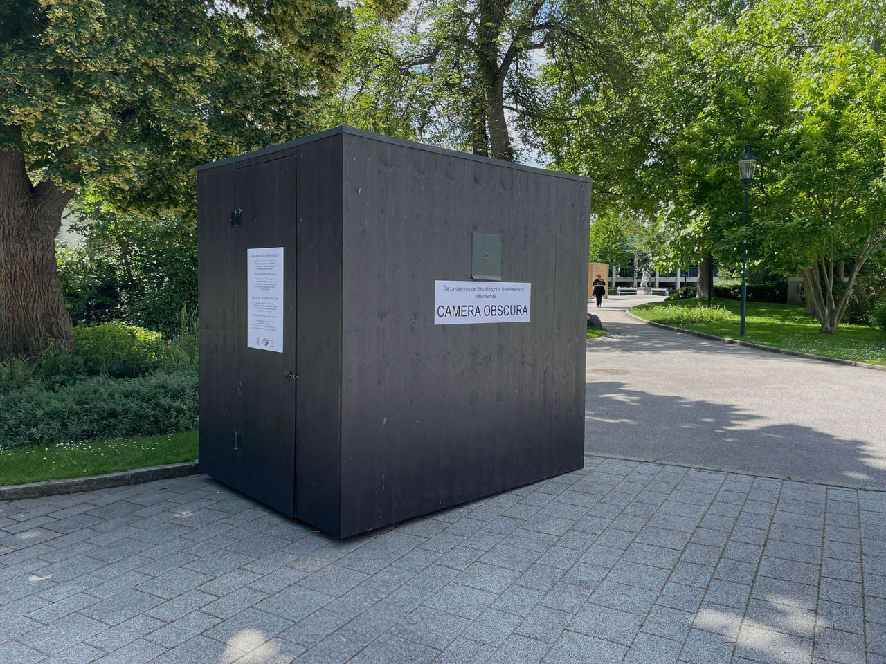 Durch ein kleines Loch in einer der Wände wird die Umgebung im Inneren des Kubus abgebildet,