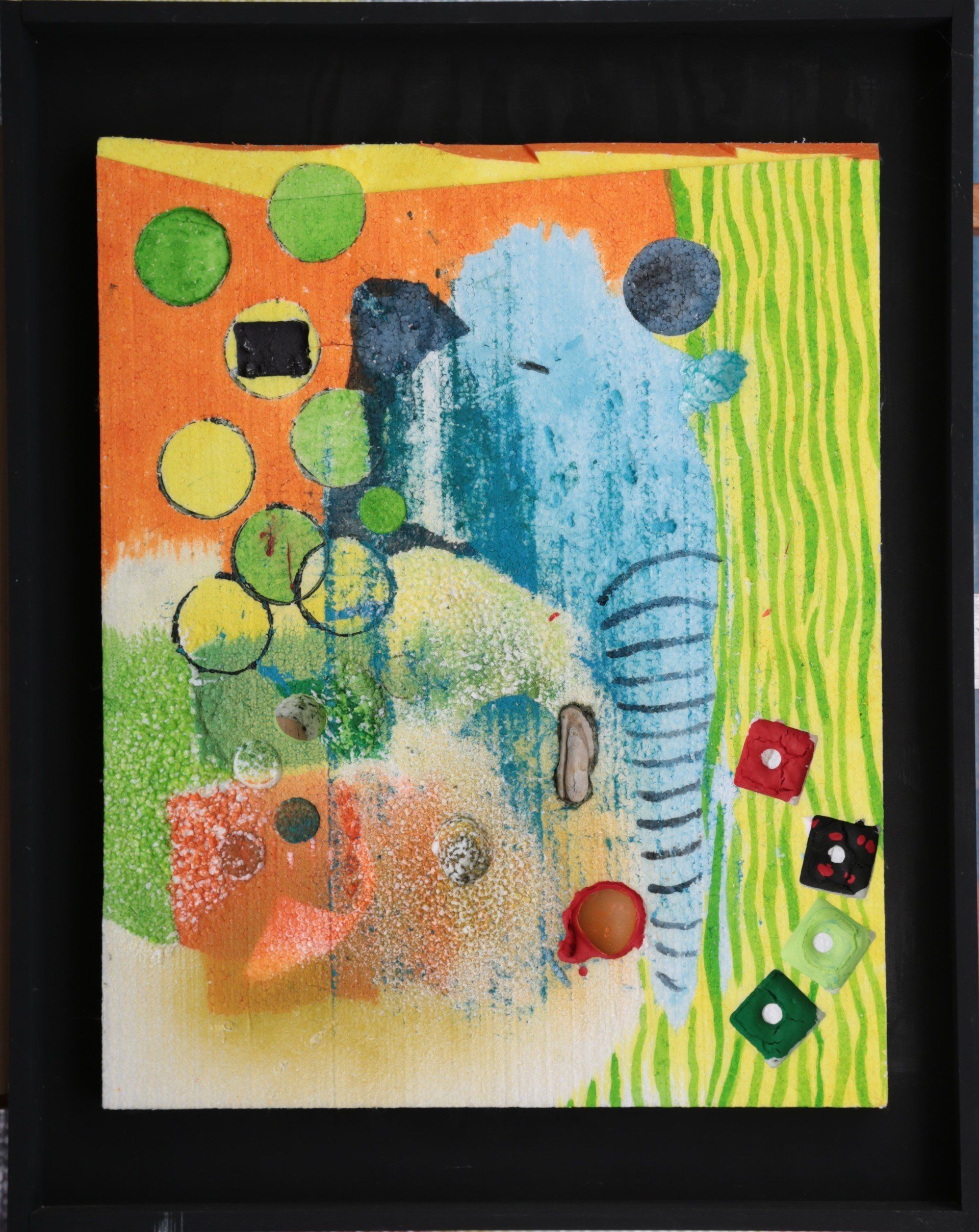 ButtonOil, acrylic, stones on styrofoam board; framed
