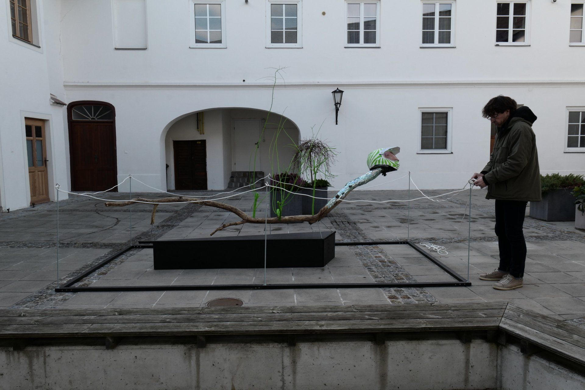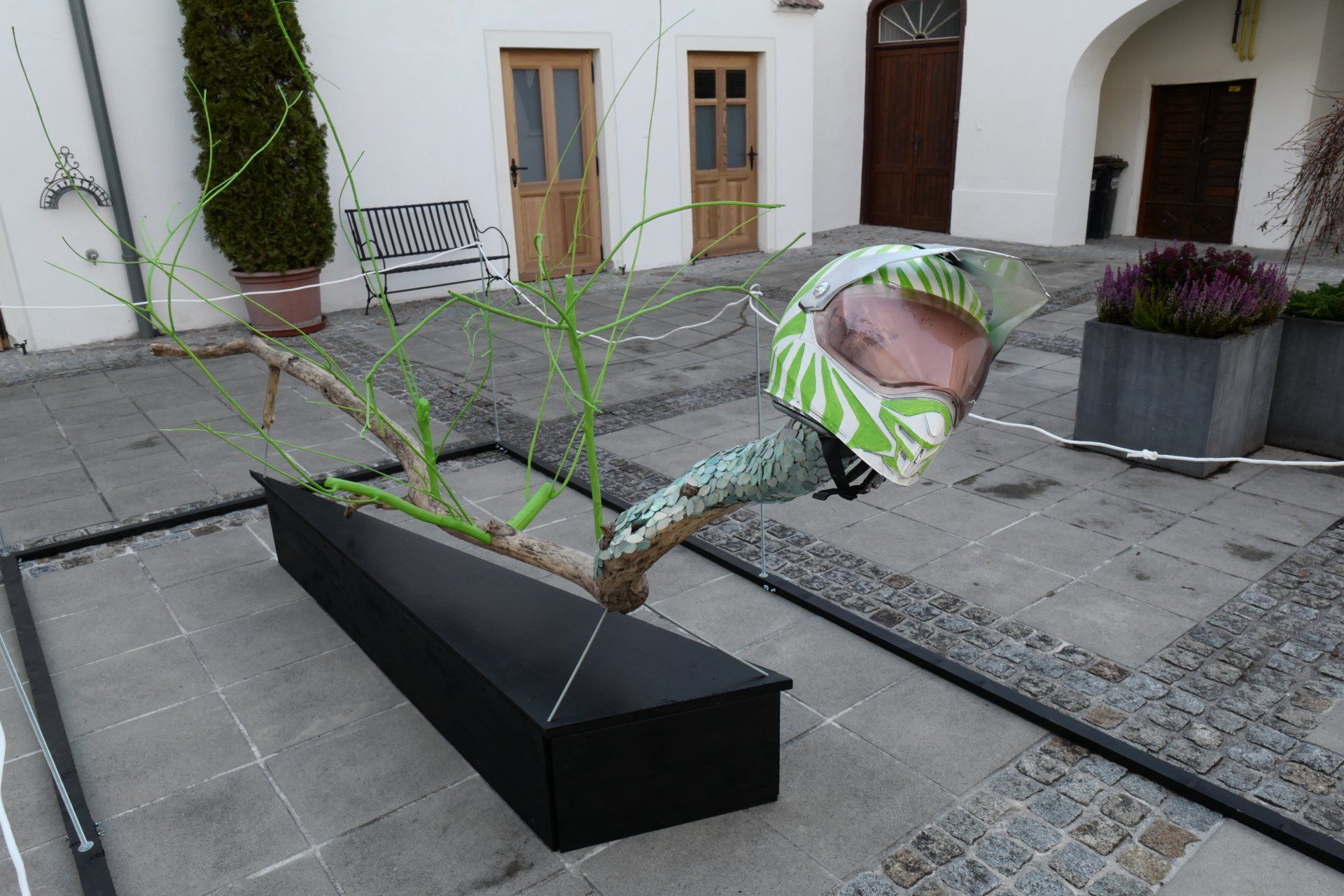 Driftwood, branches, threaded rods, motorcycle helmet, CDs, acrylic, spray, glue