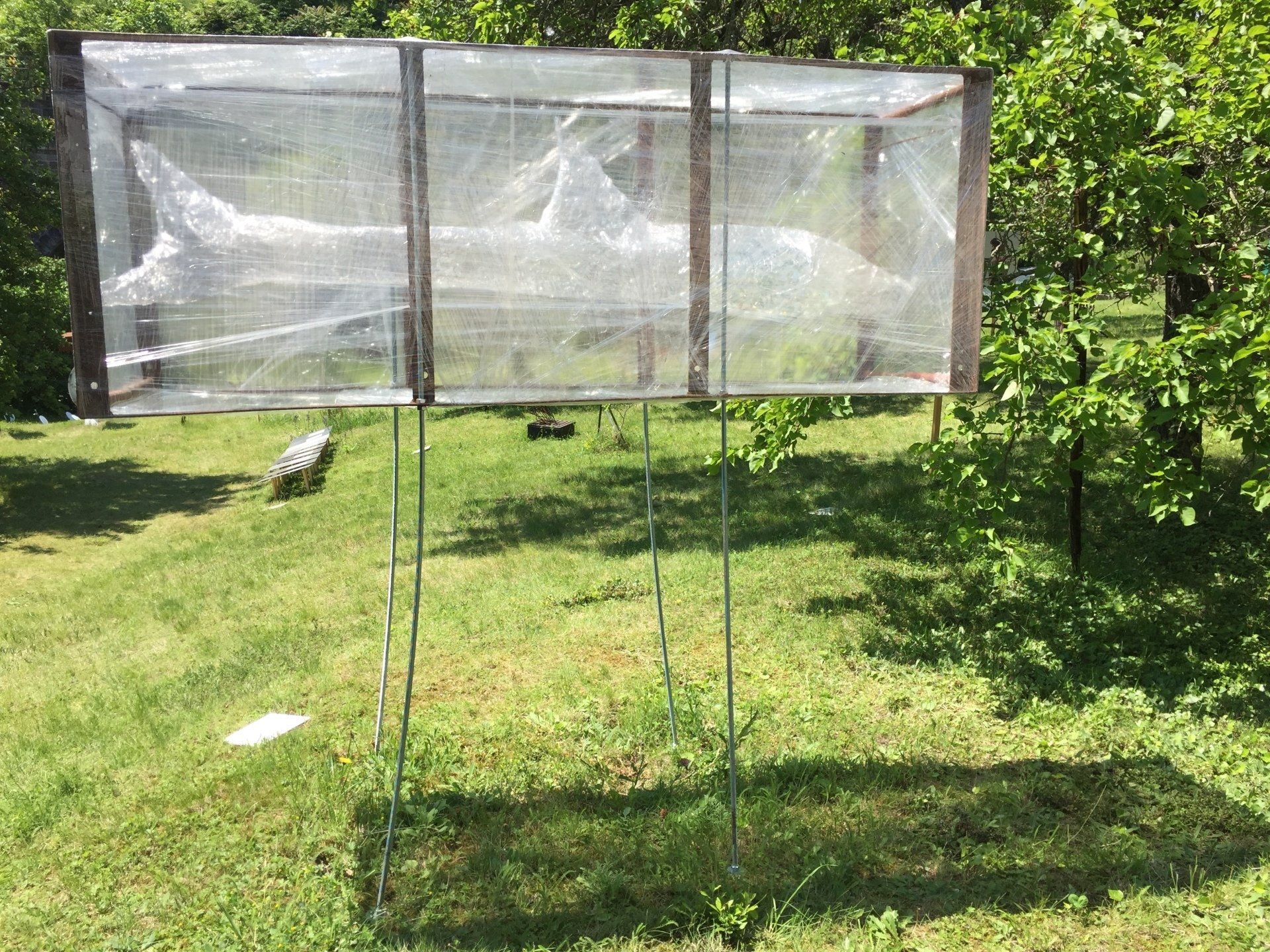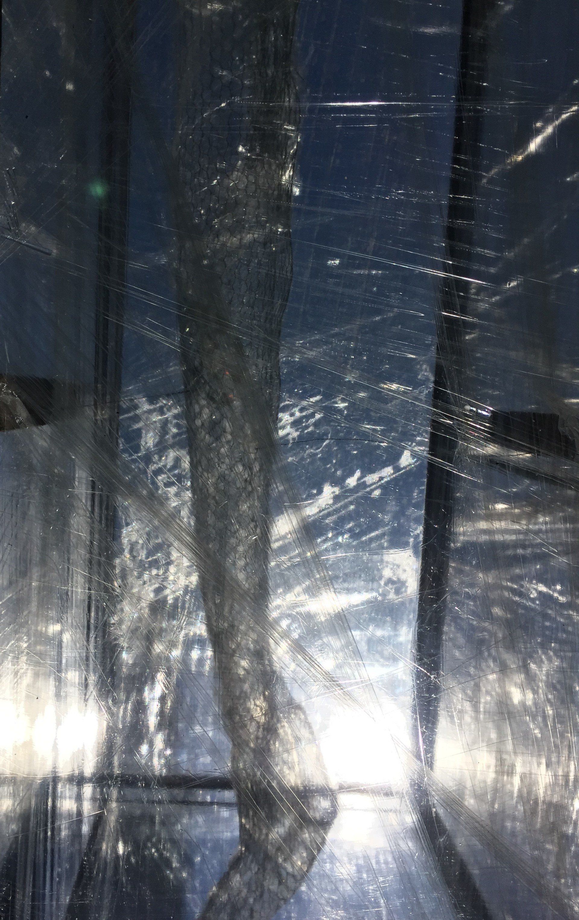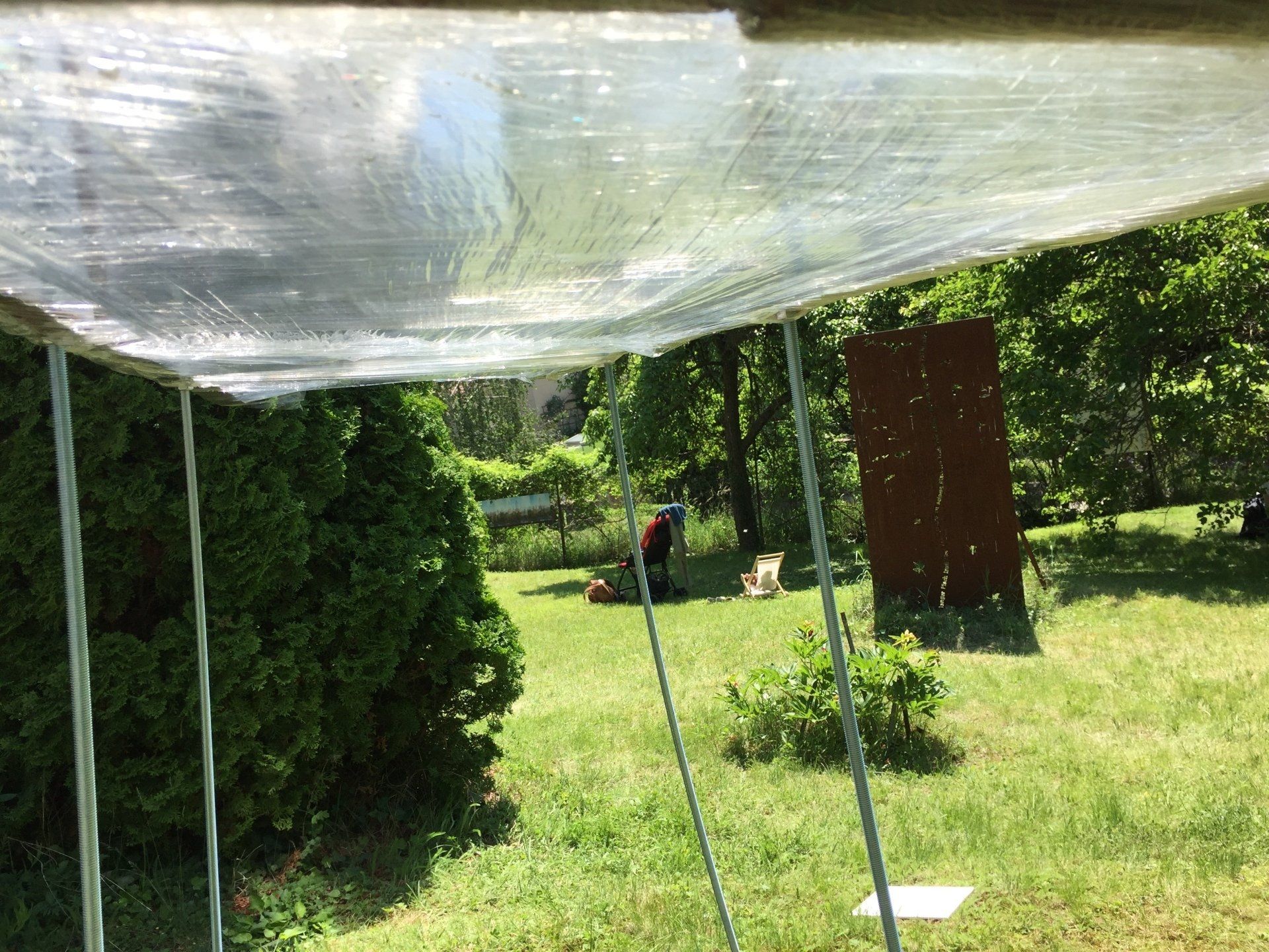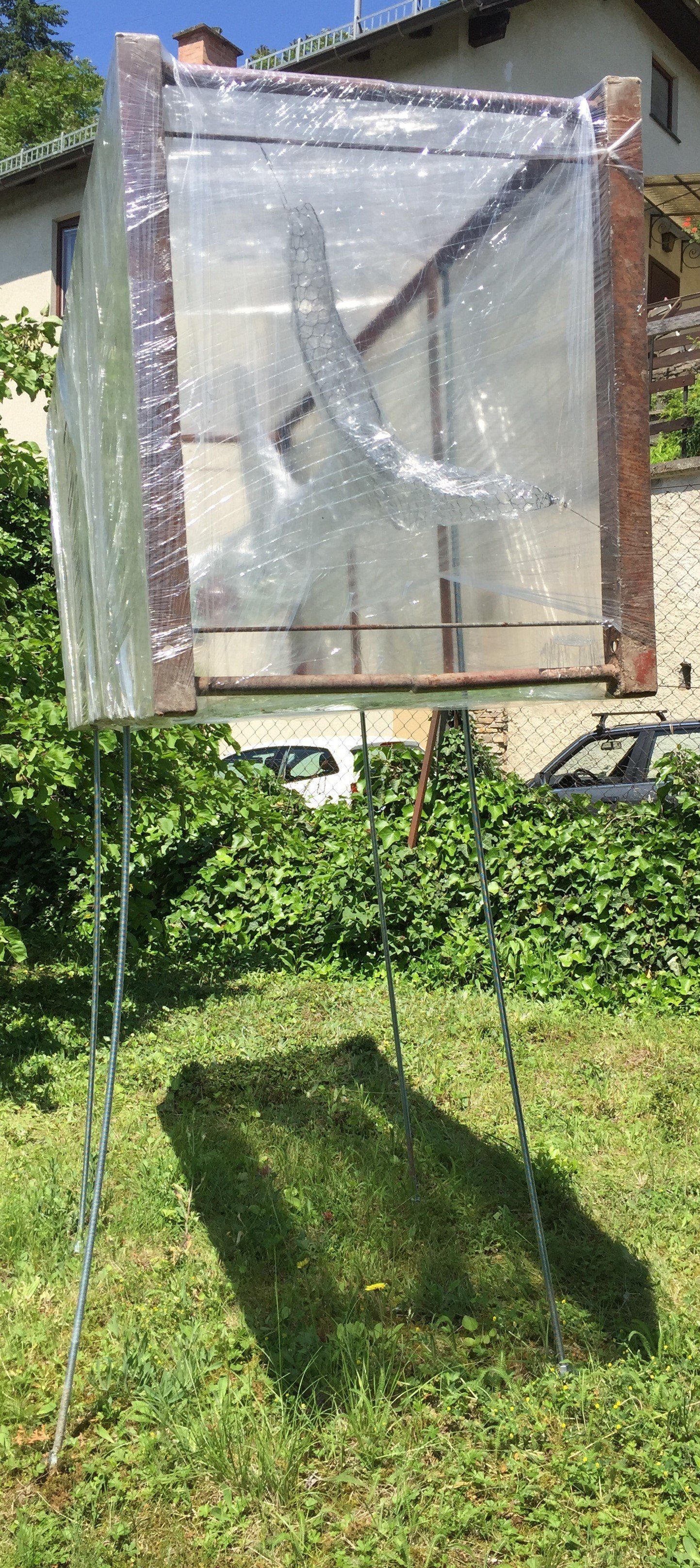 Corroded steel angles, threaded rods, bird trellis, wire, CDs, stretch film