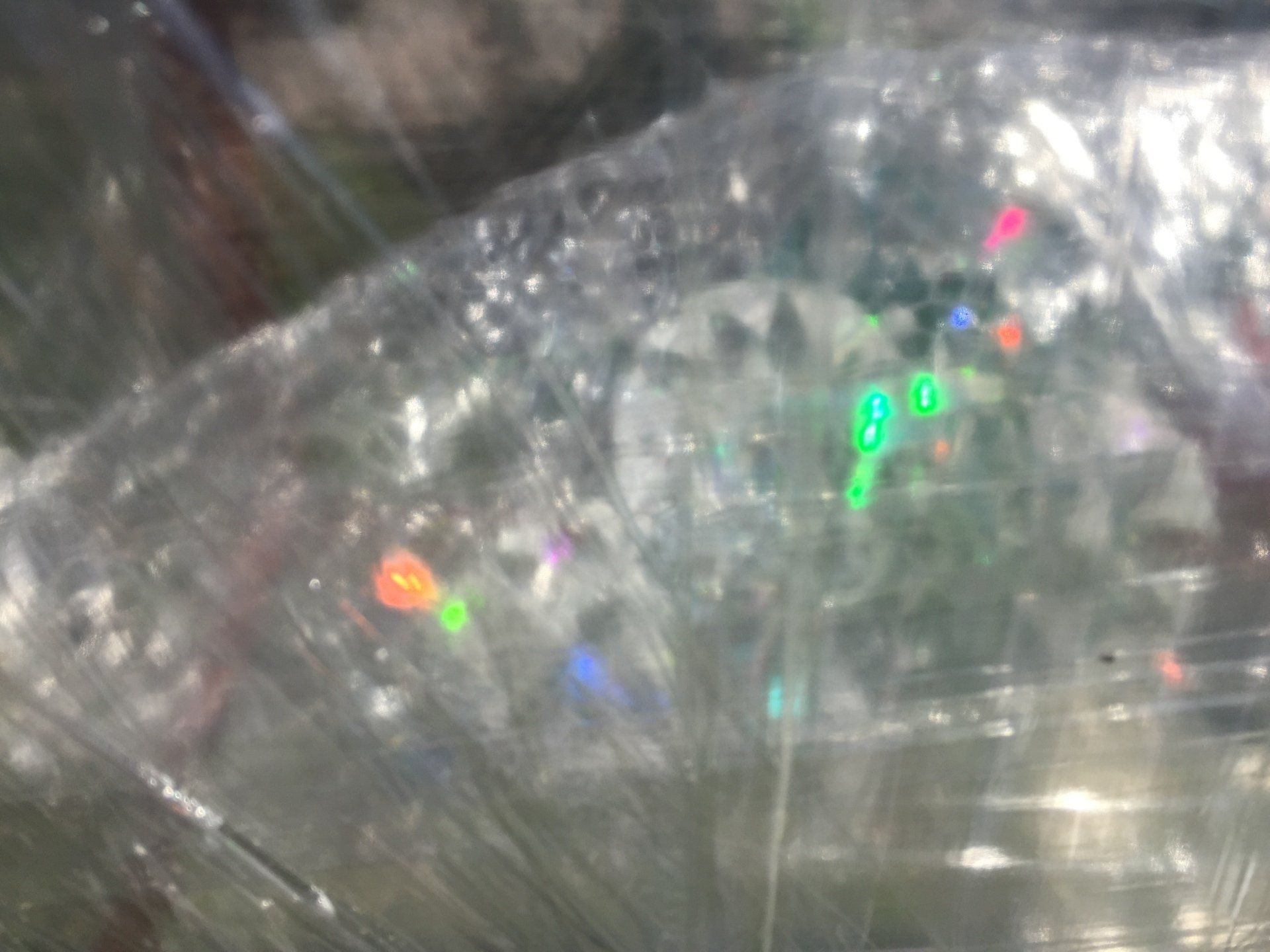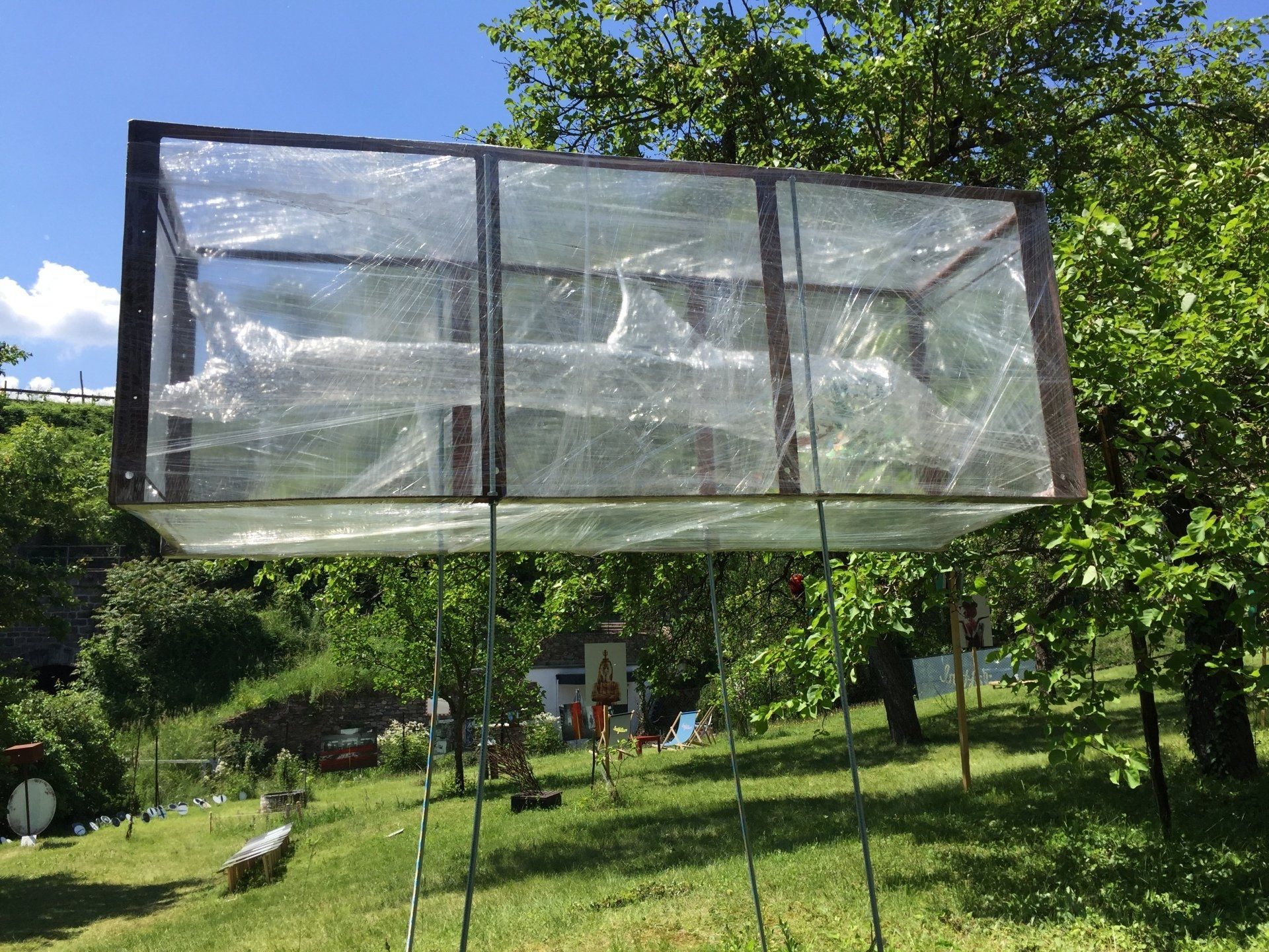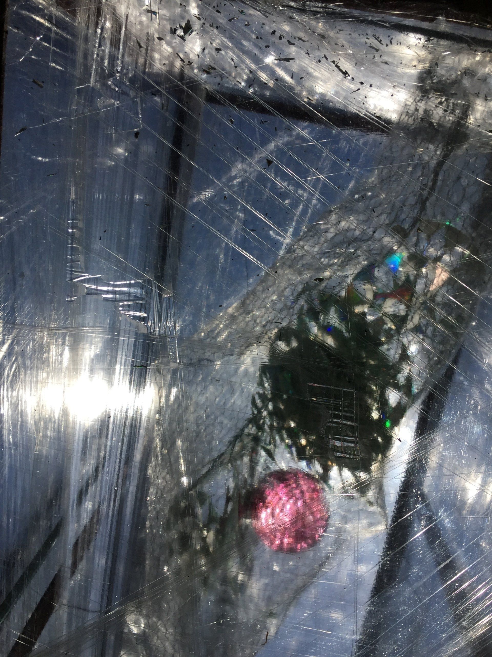 Corroded steel angles, threaded rods, bird trellis, wire, CDs, stretch film