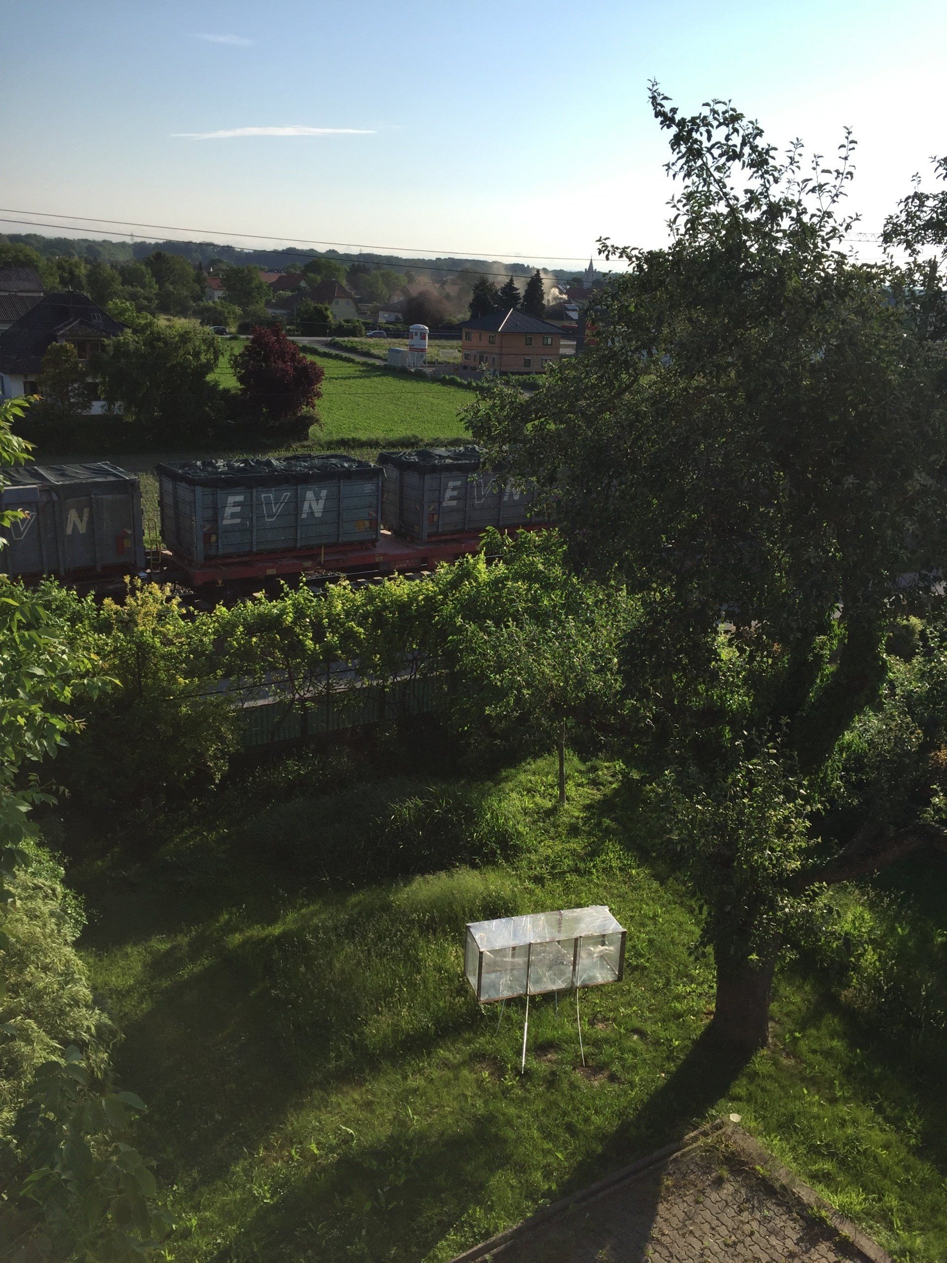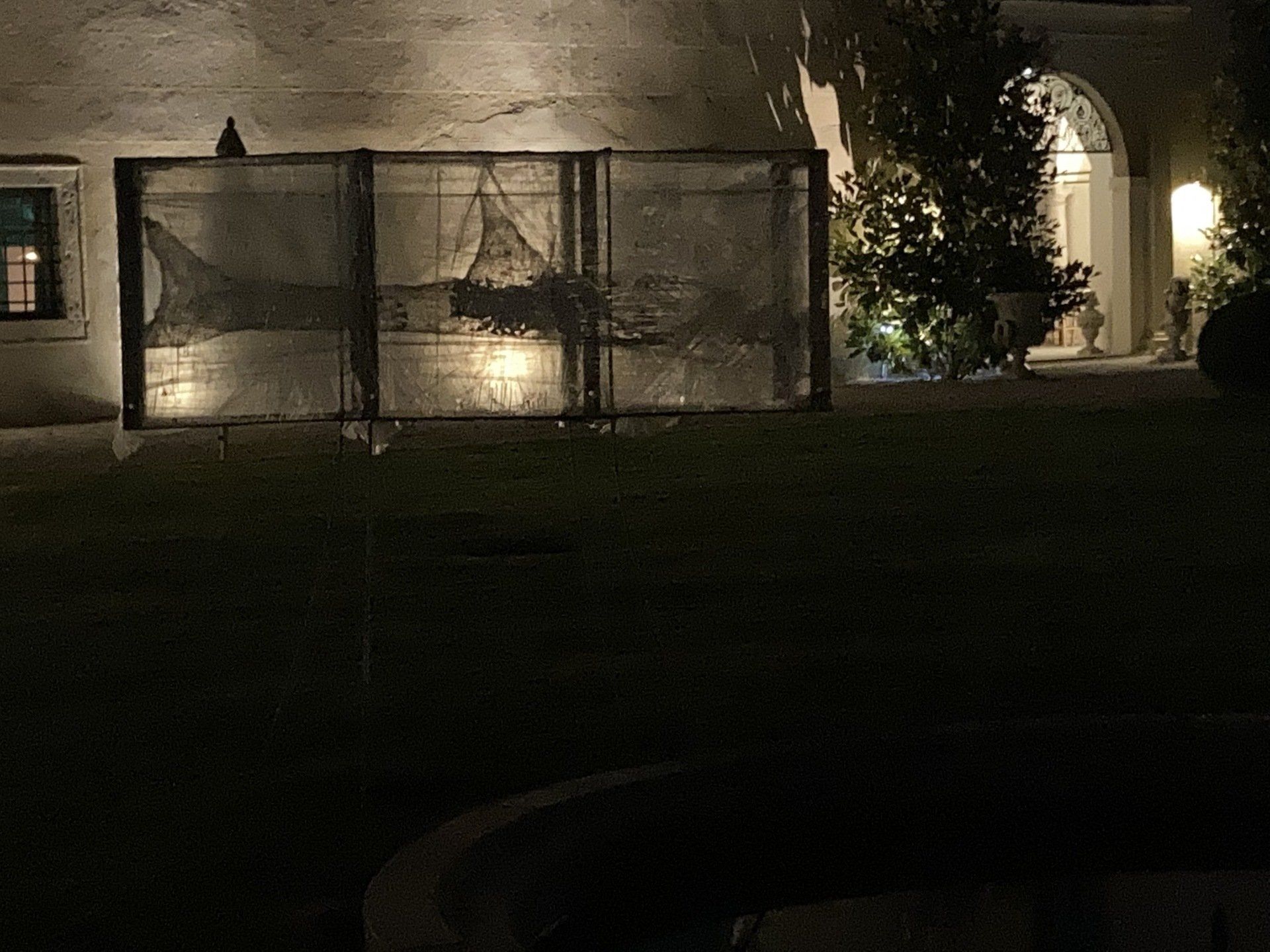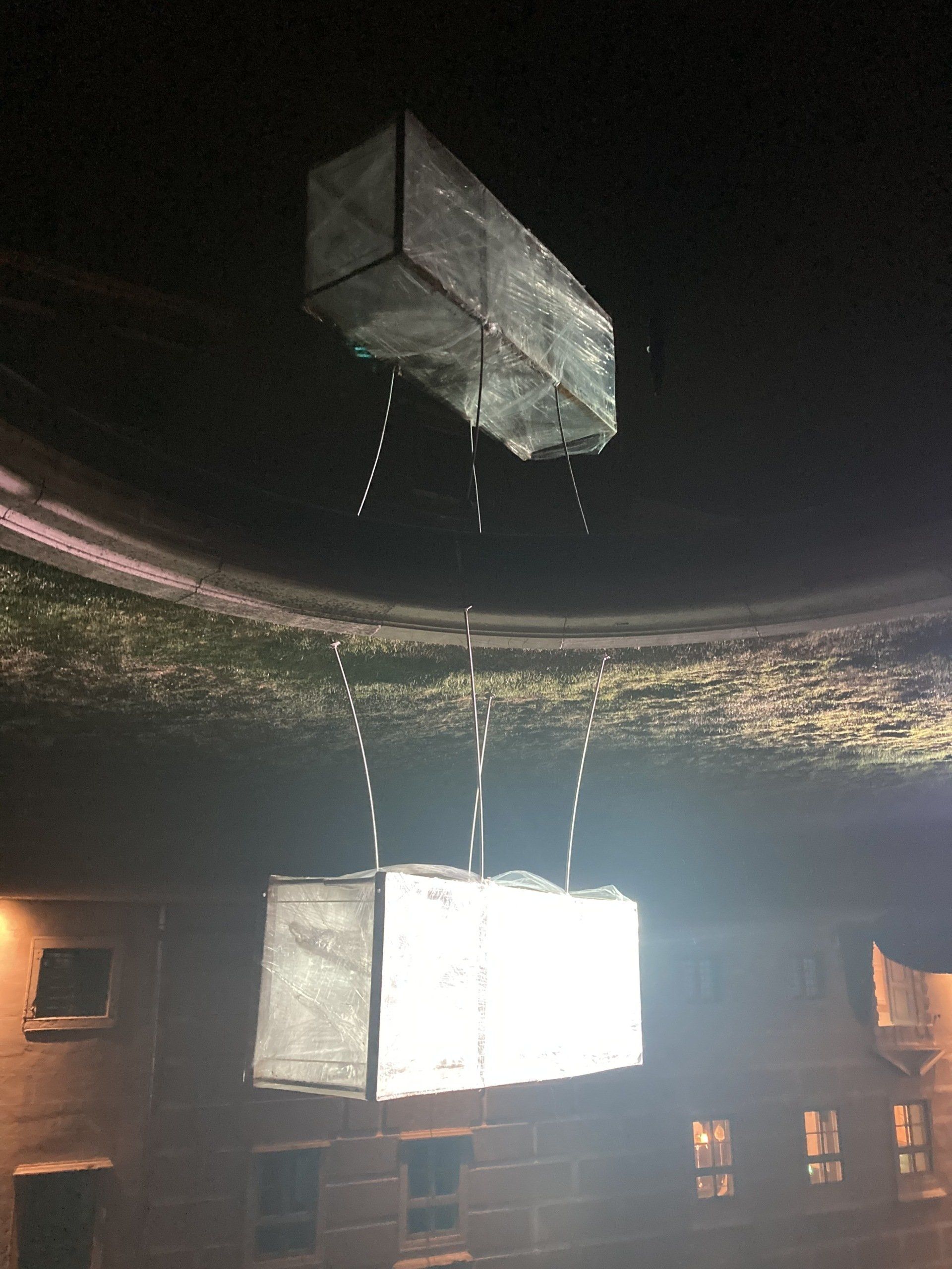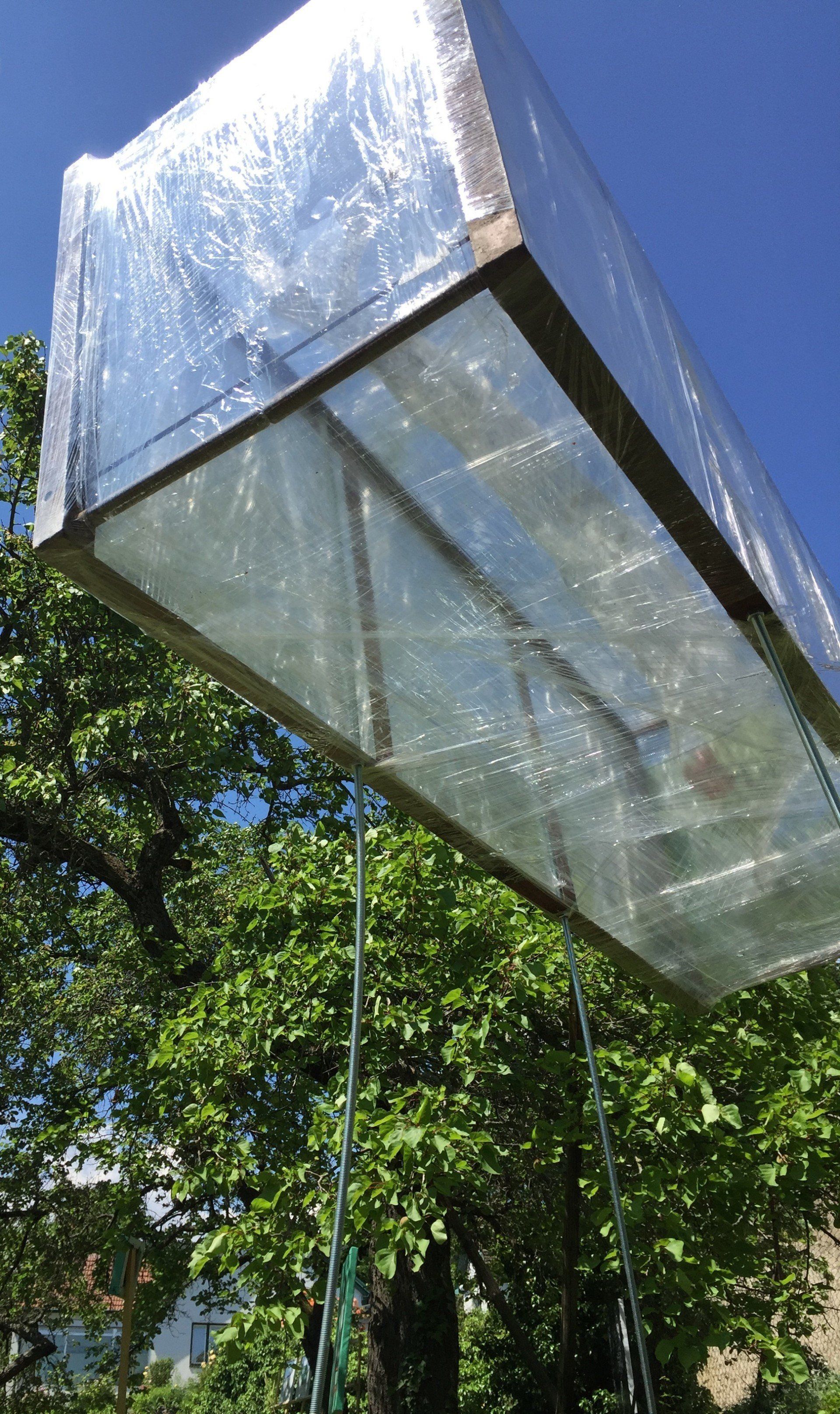 Corroded steel angles, threaded rods, bird trellis, wire, CDs, stretch film