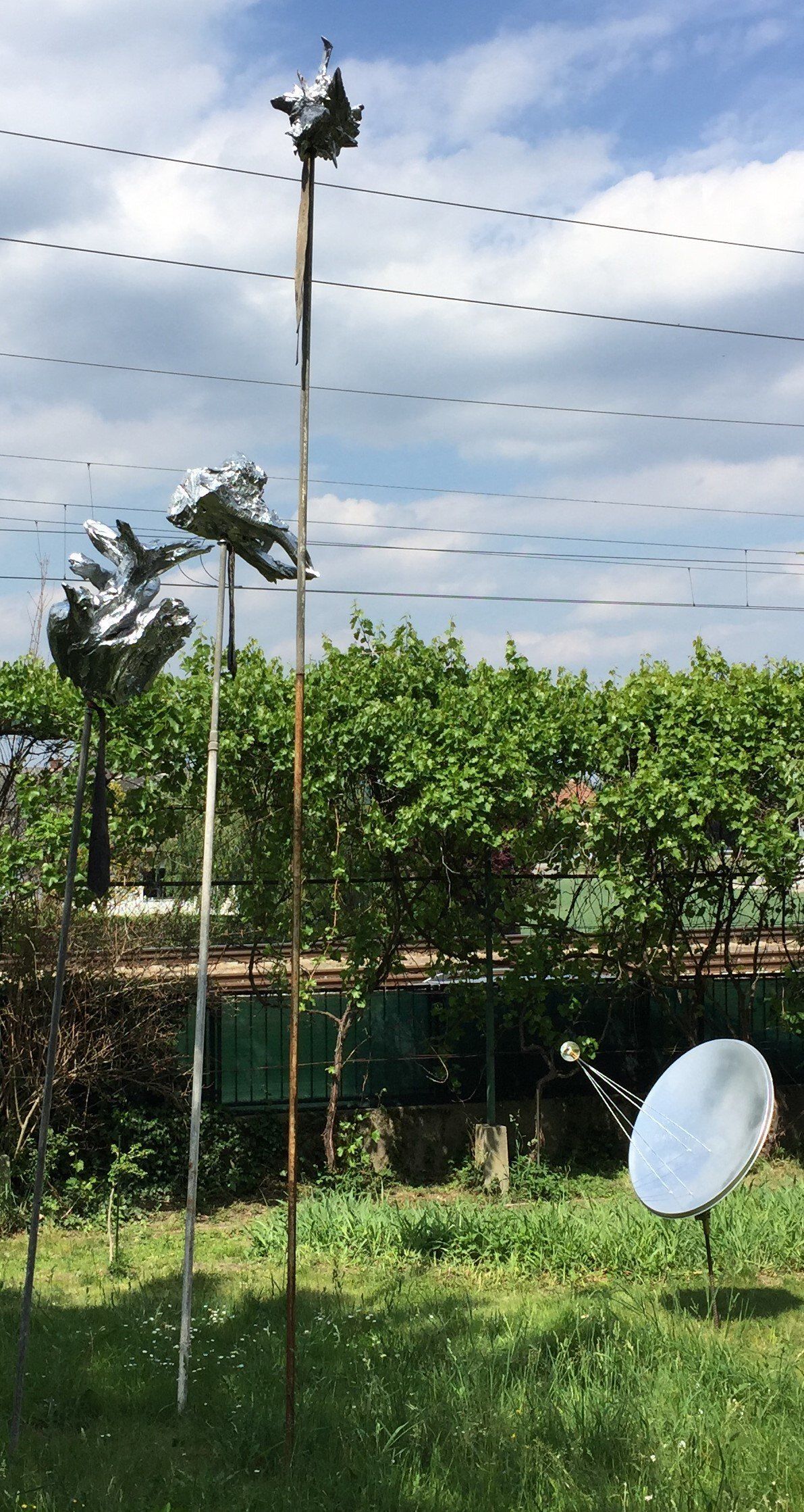 satellite dish, threaded rods, epoxy resin, dead fly, cuban shell, wire, iron pipe, pipe clamps, screws, gold spray, chrome spray