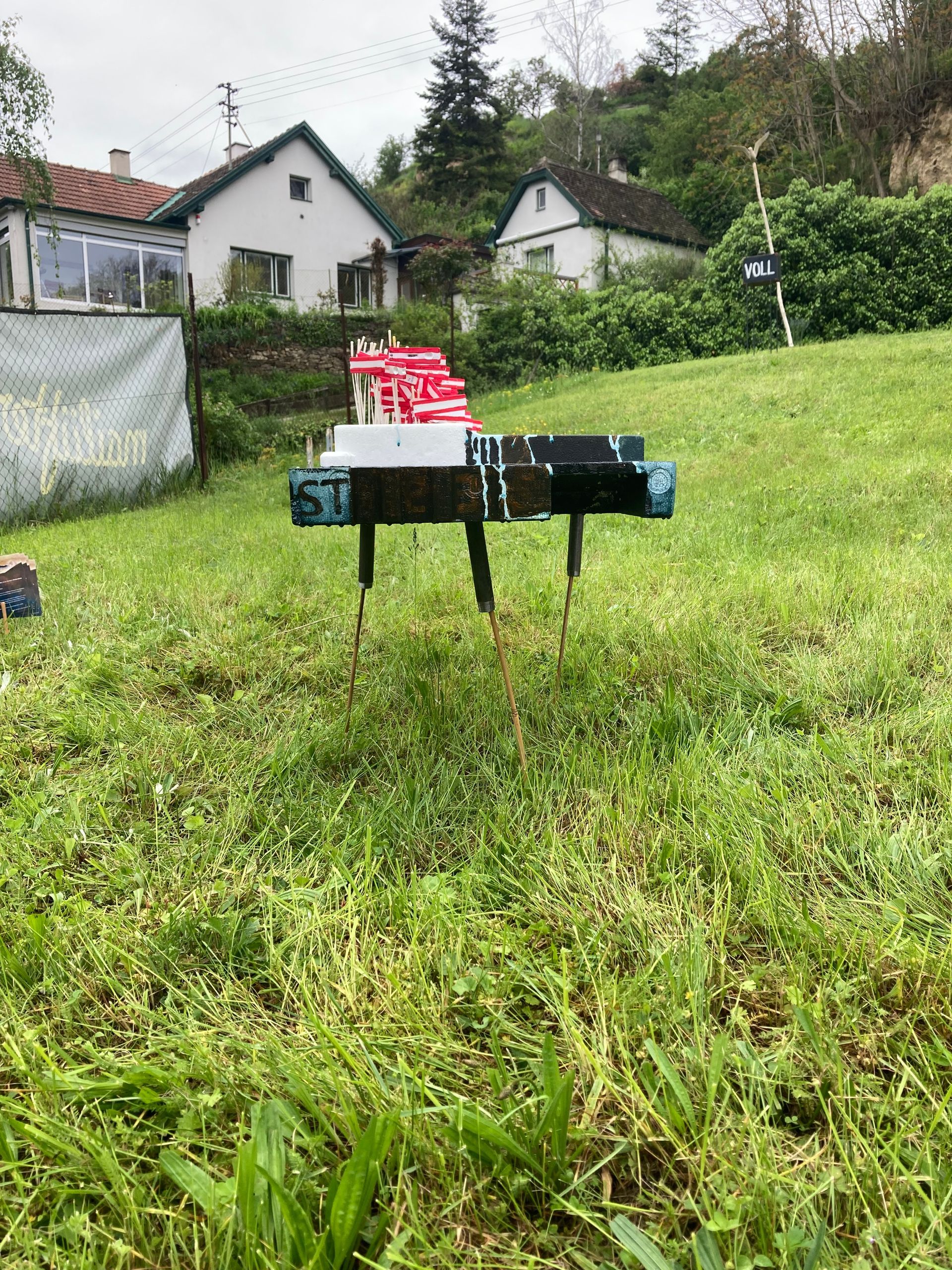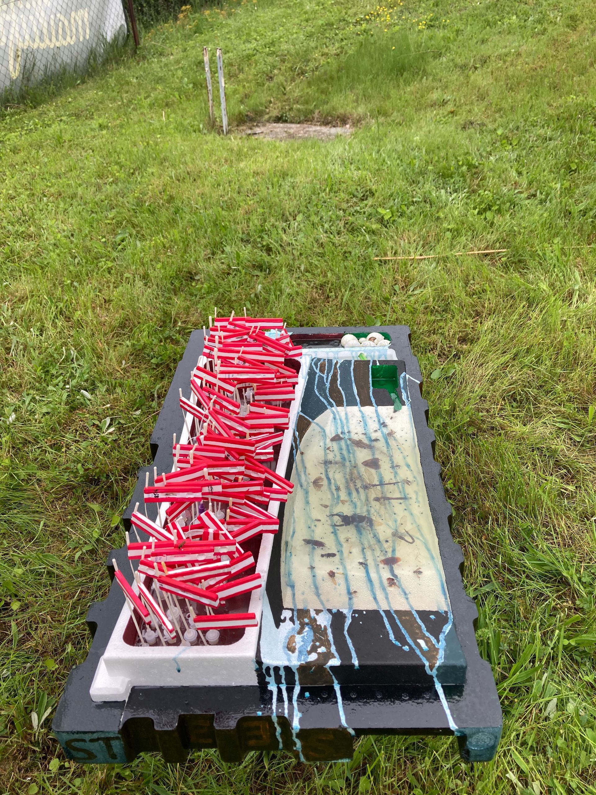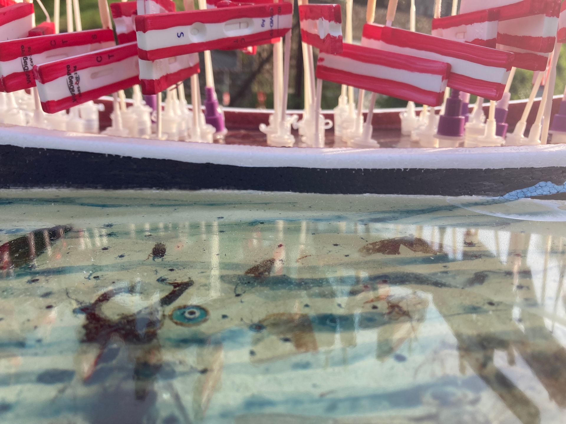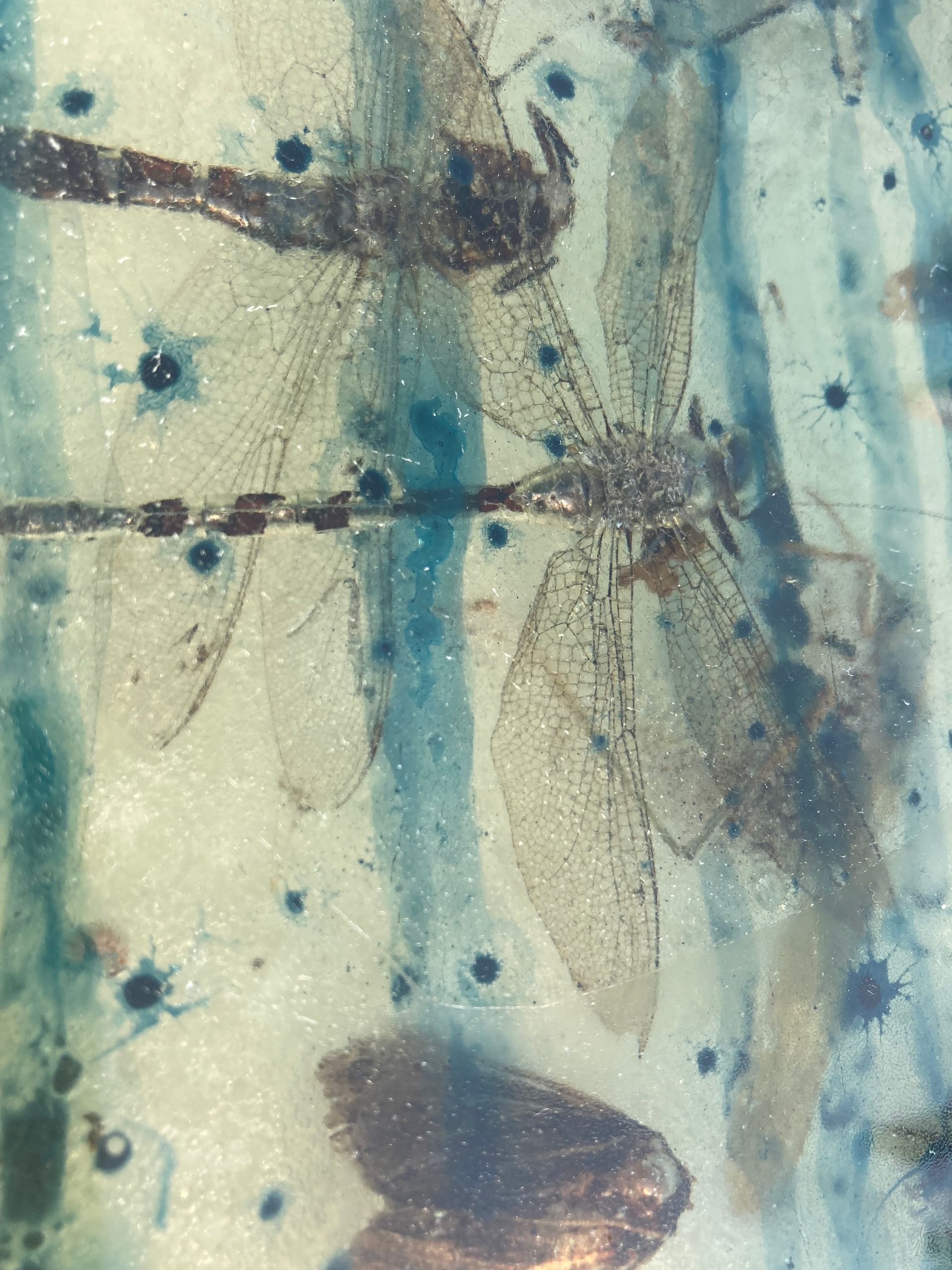 oil, acrylic, styrofoam, epoxy resin, insect exoskeletons, lizard skin, covid test kits, mussel shells, glass pipe, snail houses